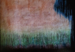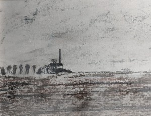 De kant fan Haskerdiken op: de jûn troch de gatten fan in sinkend skip./Richting Haskerdijken; de avond door de gaten van een zinkend schip